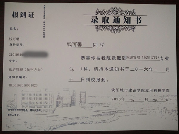 恭喜钱可馨同学被我校录取【沈城建航空】