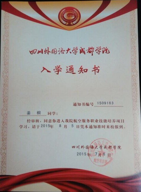 恭喜姜桐同学被我校录取【川外成都航空】