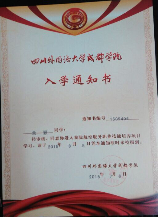 恭喜余颖同学被我校录取【川外成都航空】