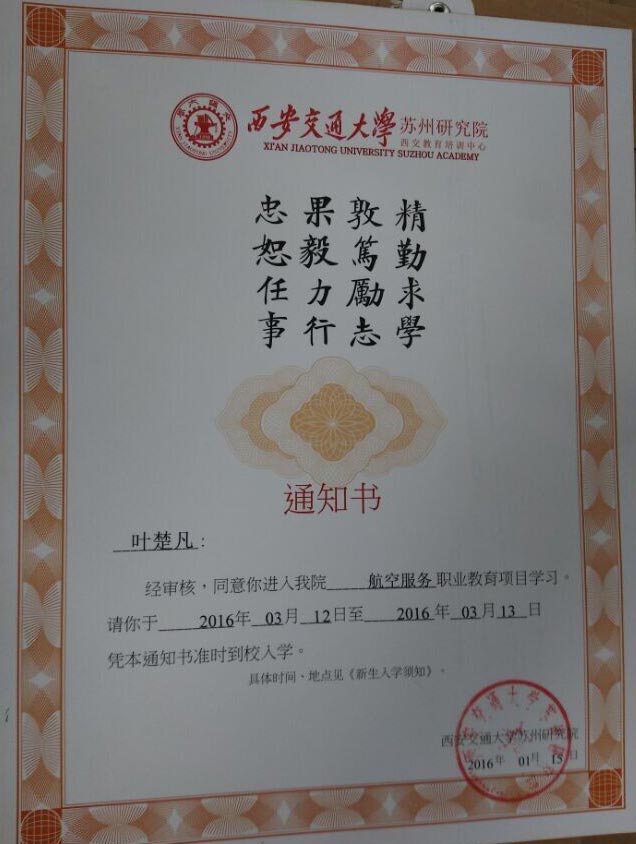 恭喜叶楚凡同学被我校录取【西交大苏州航空】